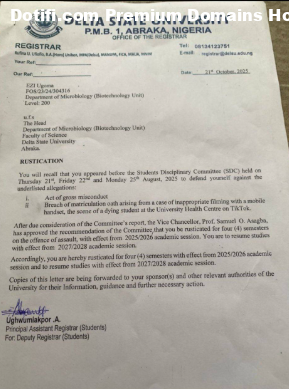 The management of Delta State University, Abraka, has rusticated a 200-level student of the Department of Microbiology, Ezi Ugoma, for four semesters for filming a dying colleague who allegedly had an abortion. According to a letter dated October 21, 2025 and signed by the schools Principal Assistant Registrar, Ughwumiakpor A, Ugoma appeared before the institutions Students Disciplinary Committee for allegedly filming the dying student at the universitys health centre and sharing the video on TikTok. Ughwumiakpor stated that the disciplinary action followed the committees sittings on August 21, 22, and 25, 2025, where Ugoma was accused of breaching the universitys matriculation oath. The report stated that the Vice-Chancellor, Prof. Samuel O. Asagba, approved the committees recommendation that Ugoma be rusticated for four semesters with effect from the 2025/2026 academic session. She is expected to resume her studies in the 2027/2028 session. You will recall that you appeared before the Students Disciplinary Committee held on Thursday, August 21; Friday, August 22, and Monday, August 25, 2025, to defend yourself against the underlisted allegations: i. Act of gross misconduct; ii, Breach of matriculation oath arising from a case of inappropriate filming with a mobile handset, the scene of a dying student at the University Health Centre on TikTok,” the letter reads. After due consideration of the committees report, the Vice Chancellor, Prof. Samuel O. Asagba, has approved the recommendation of the Committee that you be rusticated for four (4) semesters on the offence of assault, with effect from the 2025/2026 academic session. “Accordingly, you are hereby rusticated for four semesters with effect from the 2025/2026 academic session and to resume studies with effect from the 2027/2028 academic session.” Ughwumiakpor added that copies of the letter were being forwarded to her sponsor and other relevant authorities of the University for their Information, guidance, and further necessary action. The post Delta varsity rusticates student for filming her dying colleague in health centre and sharing the video on TikTok appeared first on Linda Ikeji Blog.