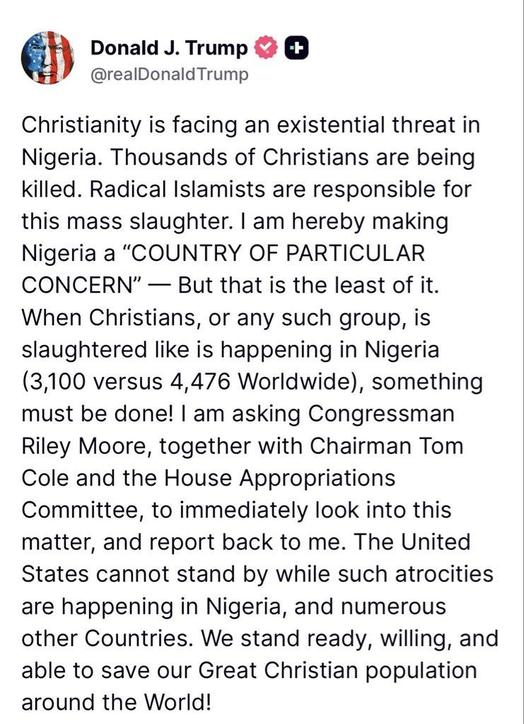 US President Donald Trumps administration has redesignated Nigeria as a country of particular concern over reports of genocide against Christians. In a statement issued on social Media, on Friday, October 31, Trump said Christianity was facing an existential threat in Nigeria.Christianity is facing an existential threat in Nigeria. Thousands of Christians are being killed. Radical Islamists are responsible for this mass slaughter. I am hereby making Nigeria a COUNTRY OF PARTICULAR CONCERN But that is the least of it. When Christians, or any such group, is slaughtered like is happening in Nigeria (3,100 versus 4,476 Worldwide), something must be done!I am asking Congressman Riley Moore, together with Chairman Tom Cole and the House Appropriations Committee, to immediately look into this matter, and report back to me.’The United States cannot stand by while such atrocities are happening in Nigeria, and numerous other Countries. We stand ready, willing, and able to save our Great Christian population around the World!US Senator Ted Cruz recently made the claim of a Christian genocide in Nigeria, a claim that has refuted by the Federal government and some Religious leaders.Senator Ted Cruz alleged that Nigeria is experiencing a “Christian genocide,” claiming that Christians are being targeted and executed for their faith by Islamist terrorist groups. The post Trump redesignates Nigeria as Country of particular concern over Christian Genocide claims appeared first on Linda Ikeji Blog.