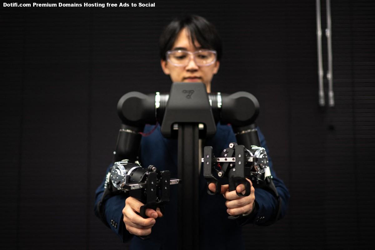 A pair of swivelling, human-like robotic arms, built for physical artificial intelligence research, mirror the motions of an operator in a VR headset twirling his hands like a magician.